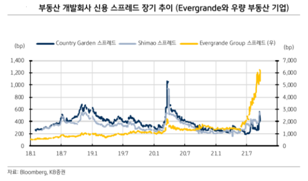 박 연구원은 “투기등급 중 부동산 섹터의 약세가 두드러지지만 아직은 부동산 개발 기업이 전반적으로 유동성이나 부도 위험에 직면한 것은 아니다”라며 “헝다보다 신용등급이 높은 기업들의 회사채 스프레드는 20일 큰 폭으로 확대되기는 했지만 그 이후에는 다소 안정된 모습”이라고 말했다.