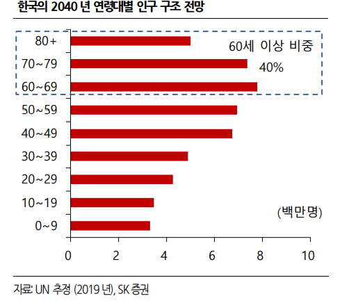 한국 사회가 고령화되고 있다. 2019년 UN 조사에 따르면, 한국 인구 중 60세 이상 인구는 지난해 기준 1190만명으로 전체 인구의 23% 정도를 차지했지만 2040년에는 2010만명으로 비중이 40%에 육박할 전망이다. 인구는 줄어드는데 고령 인구는 늘어나는 결과다.