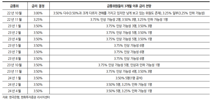 금통위원들 중에는 향후 3개월 금리 전망에 대해서도 유지해야 한다는 의견이 5명으로 많았다. 인하 가능성을 열어놔야 한다는 위원은 1명으로 지난 2월과 동일했다.